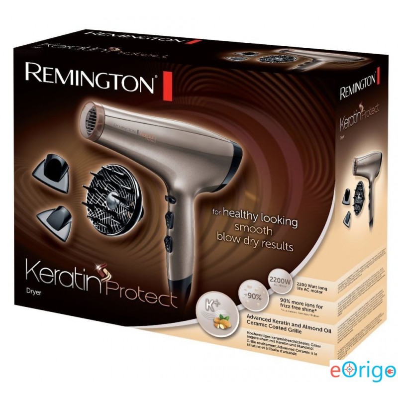 Tulajdonságok:A Remington AC8002 Keratin Protect hajszárító AC motorral felszerelt, amely hosszabb élettartamot biztosít a készülék számára. A levegő kimeneti nyílásba épített keratin és mandula olajos bevonatú gyűrűnek és az ionos kondicionálásnak köszönhetően hajunk selymes lesz.