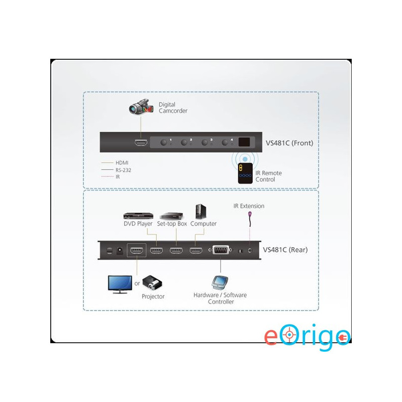 Az ATEN VS481C-ra 4 forrás eszköz csatlakoztatható és képes ezek képeit egyetlen kijelzőre továbbítani. Támogatja a True 4K felbontást (4096x2160 @ 60 Hz 4:4:4), valamint az akár 18 Gbps adatátviteli sebességet, a 3D-t, a Deep Colourt 12 bitig és a HD audio jelek veszteségmentes továbbítását. Rendelkezik automatikus switching móddal az automatikus port választáshoz, valamint rendkívül gyors váltással a HDMI bemenetek között. Az eszköz továbbá irányítható RS- 232-vel és IR távirányítóval.